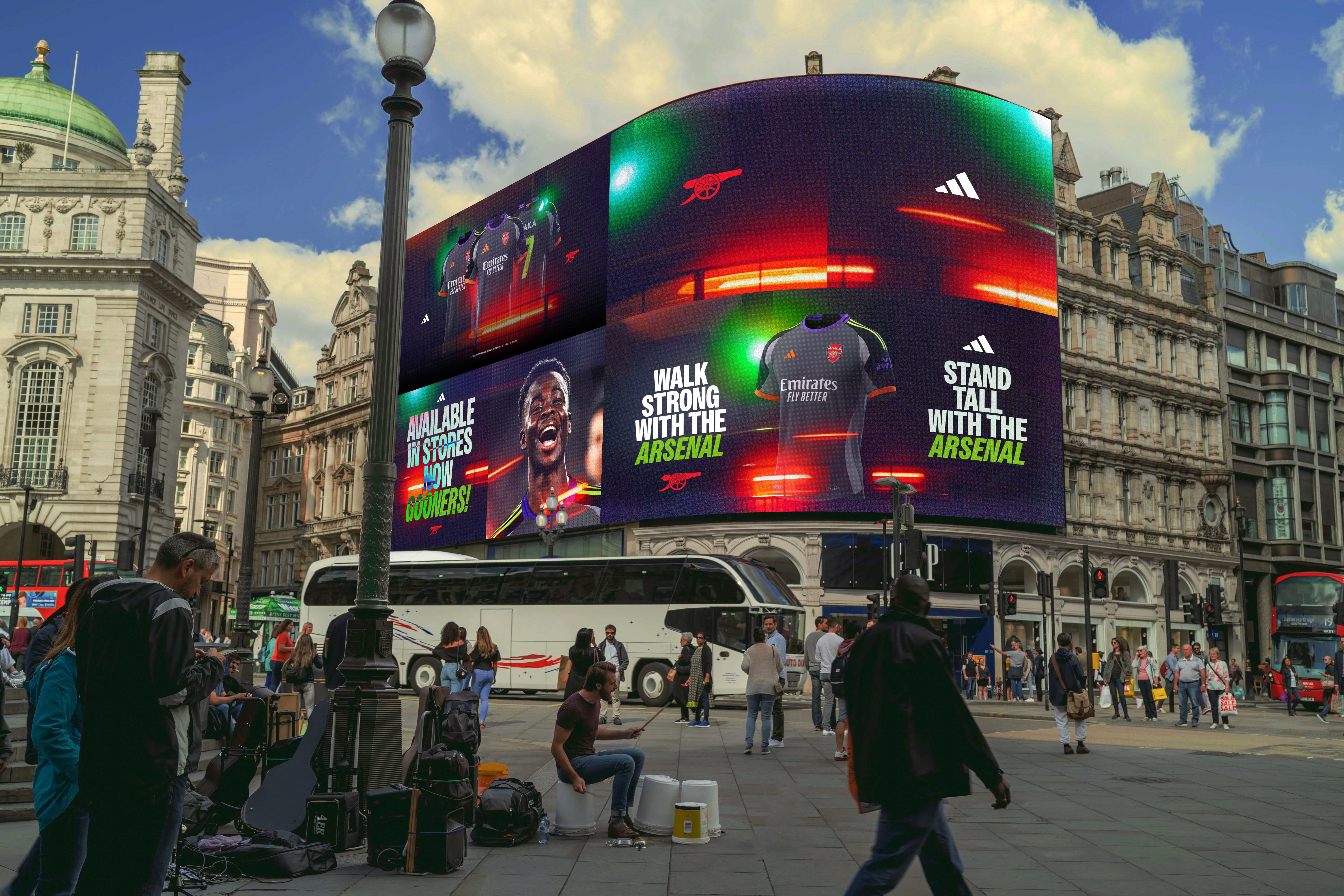 To create an advertising brand for an Arsenal Away Kit for Adidas, the design draws inspiration from the vibrant nightlife of North London. It incorporates colours found in the city's nighttime energy—such as the reds and greens of traffic lights, the glow of car headlights, and the neon signs that illuminate the streets. This visual language reflects the dynamic atmosphere of local nightlife spots, with the bright colours of the kit representing standing out in the dark. The campaign was further brought to life through OOH posters, website materials, and wristbands distributed to locals on nights out, creating a direct link to the energetic and bold spirit of the city's famous nightlife culture.
