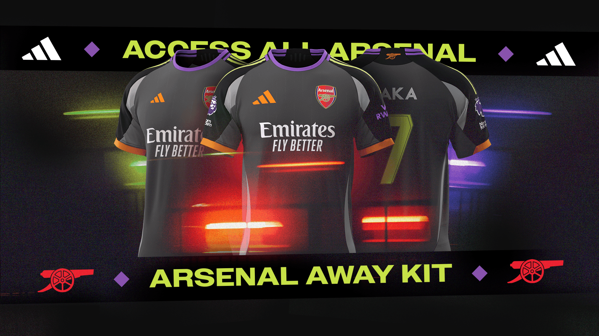 Brief: To create advertising brand look for a speculative Arsenal away kit from an unrelated season, inspired by the nightlife of London, with bold, bright colours designed to stand out at dark.