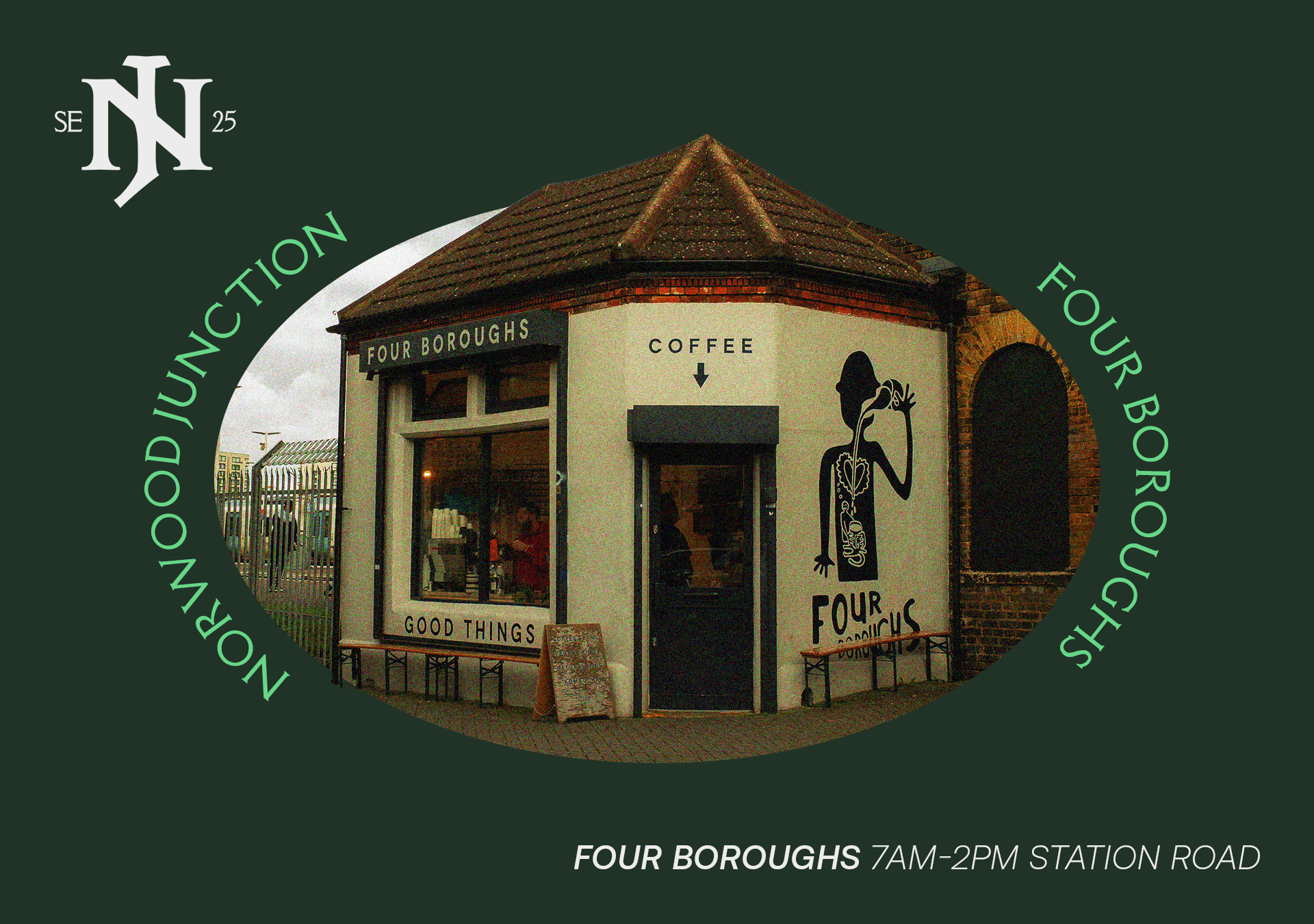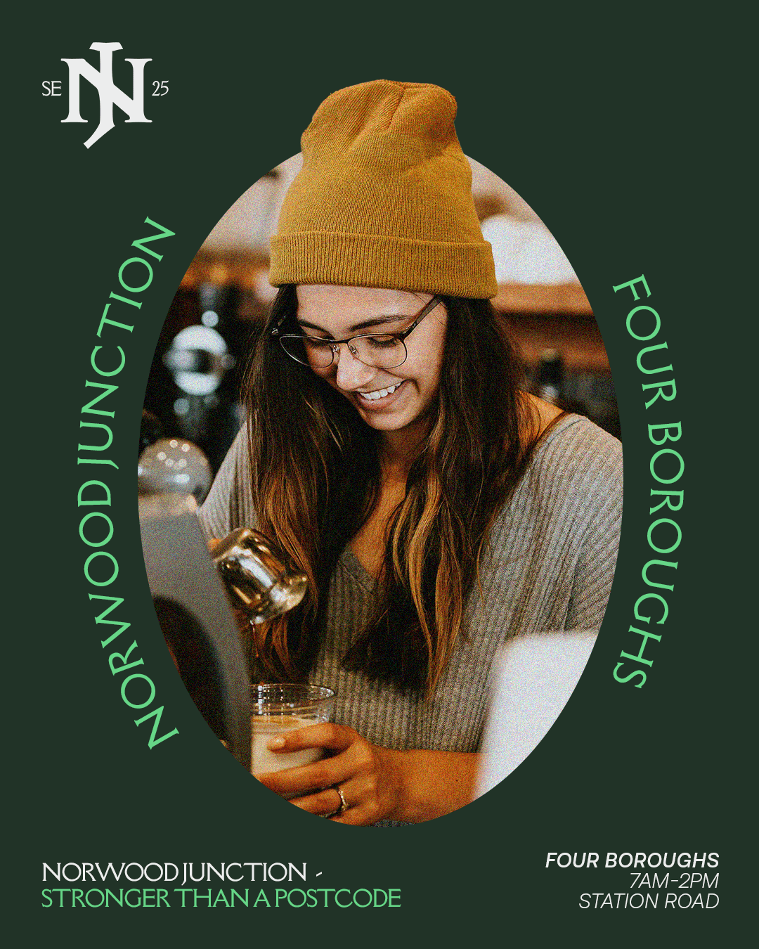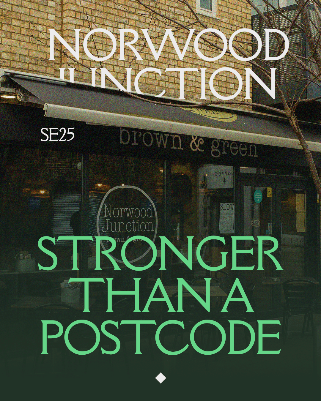 The visual identity incorporates various shades of green from deep greens that represent the area's many parks and green spaces to vibrant greens that symbolise its diverse and lively communities. Striking typography clean layouts and a strong colour palette establish a confident and modern aesthetic. Inspired by urban culture and local architecture the design elements reflect the energy and individuality of Norwood Junction. The campaign features a mix of print and digital assets including posters and social media graphics reinforcing the area’s distinct presence.